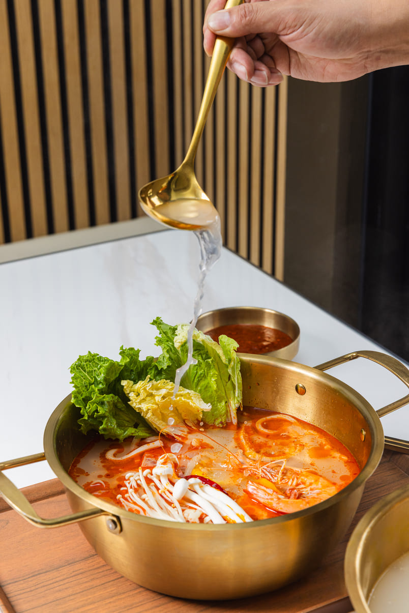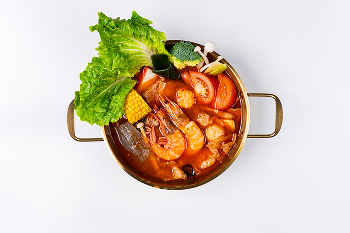 A bright, tangy tomato broth with rich depth and a hint of sweetness.